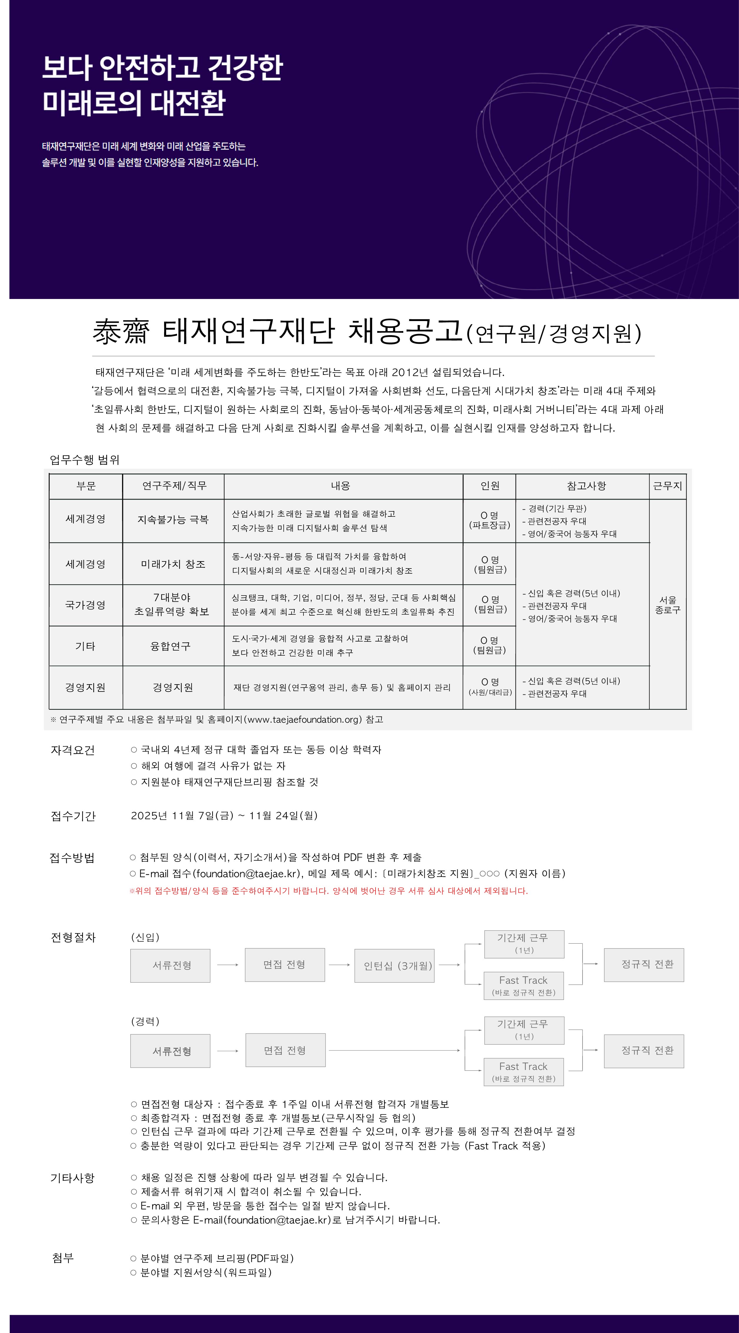 태재연구재단 연구원·경영지원담당 채용공고