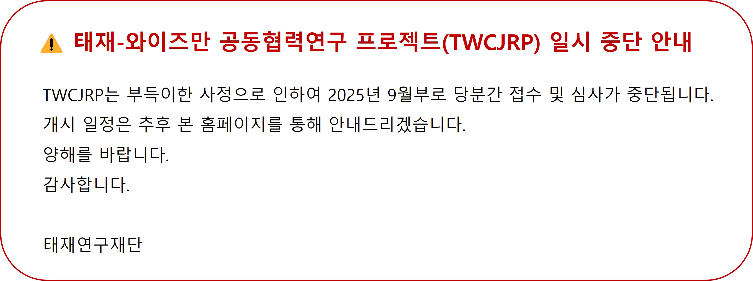 태재연구재단은 태재미래전략연구원과 함께 이스라엘 와이즈만연구소와 공동협력연구-프로젝트를 진행한다. 각 프로젝트는 국내 대학/기관의 한국인 연구자들과 와이즈만연구소 연구자들이 공동협력연구팀을 이루어 진행된다. 태재와 와이즈만은 이를 위해 2024년 8월부로 연구공모에 들어갔다. 선정된 팀은 매년 20만불씩 최소 3년에서 최대 5년간 지원받게 된다. 해당 프로젝트는 미래
